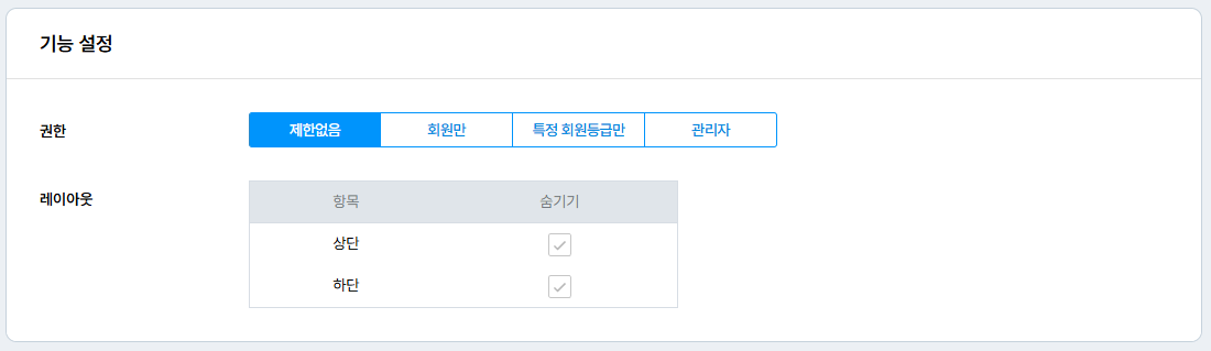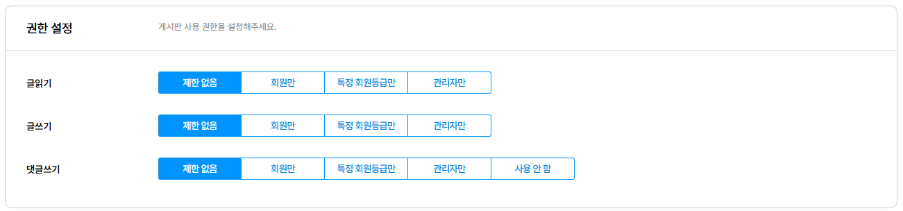 관리자 페이지 > 사이트 관리 > 게시판의 각 게시판 설정에서 글읽기, 글쓰기, 댓글 쓰기 권한을 설정할 수 있어요.