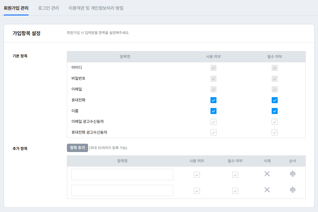 회원가입 시 입력받을 항목을 설정하고 추가할 수 있습니다.
